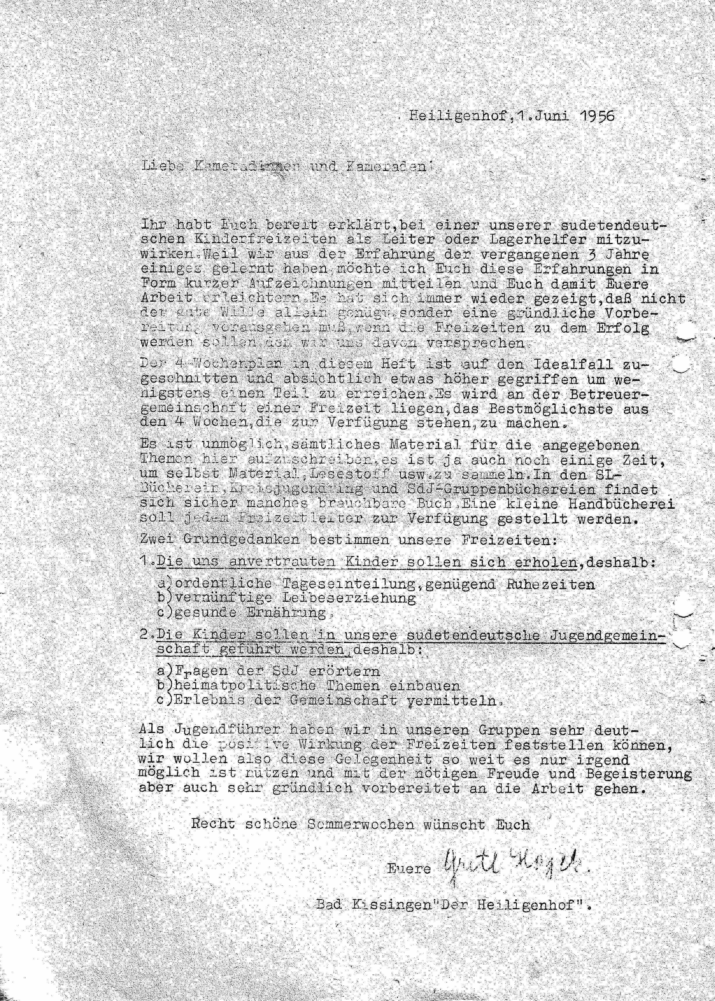 Als Jugendführer haben wir in unseren Gruppen sehr deutlich die positive Wirkung der Freizeiten feststellen können, wir wollen also diese Gelegenheit so weit es nur irgend möglich ist nützen und mit der nötigen Freude und Begeisterung aber auch sehr gründlich vorbereitet an die Arbeit gehen.