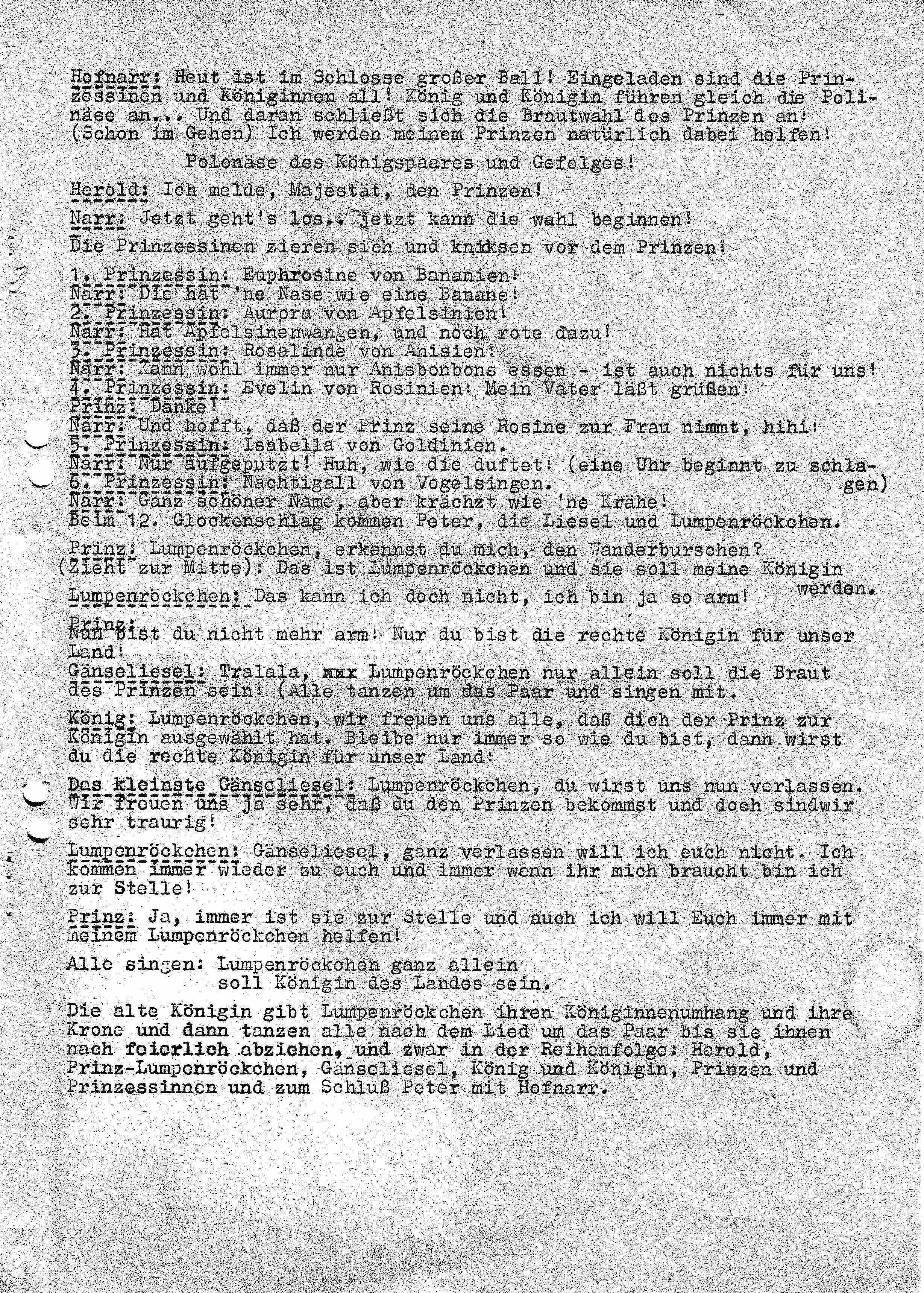 Polonäse des Königspaares und Gefolges! Herold: Ich melde, Majestät, den Prinzen! Narr: Jetzt geht‘s los ... jetzt kann die Wahl beginnen! Die Prinzessinnen zieren sich und knicksen vor dem Prinzen! 1. Prinzessin: Euphrosine von Bananien! Narr: Die hat ‘ne Nase wie eine Banane! 2. Prinzessin: Aurora von Apfelsinien! Narr: Hat Apfelsinenwangen, und noch rote dazu! 3. Prinzessin: Rosalinde von Anisien! Narr: Kann wohl immer nur Anisbonbons essen -- ist auch nichts für uns! 4. Prinzessin: Evelin von Rosinien! Mein Vater läßt grüßen! Prinz: Danke! Narr: Und hofft, daß der Prinz seine Rosine zur Frau nimmt, hihi! 5. Prinzessin: Isabella von Goldinien. Narr: Nur aufgeputzt! Huh, wie die duftet! (eine Uhr beginnt zu schlagen) 6. Prinzessin: Nachtigall von Vogelsingen. Narr: Ganz schöner Name, aber krächzt wie ‘ne Krähe! Beim 12. Glockenschlag kommen Peter, die Liesel und Lumpenröckchen. Prinz: Lumpenröckchen, erkennst du mich, den Wanderburschen?